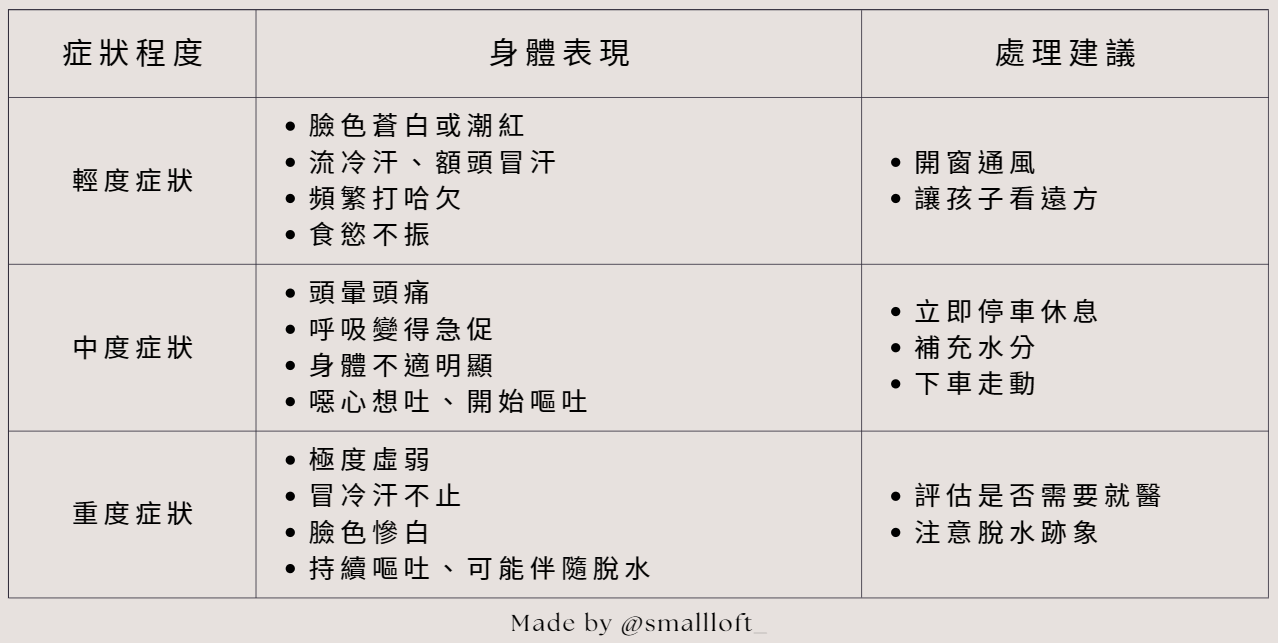 爸爸媽媽需要特別留意孩子的暈車徵兆,尤其是還不會說話的寶寶更需要仔細觀察!如果寶貝開始臉色慘白、身體不適,就要注意是不是雲車了。以下整理了不同嚴重程度的暈車症狀: