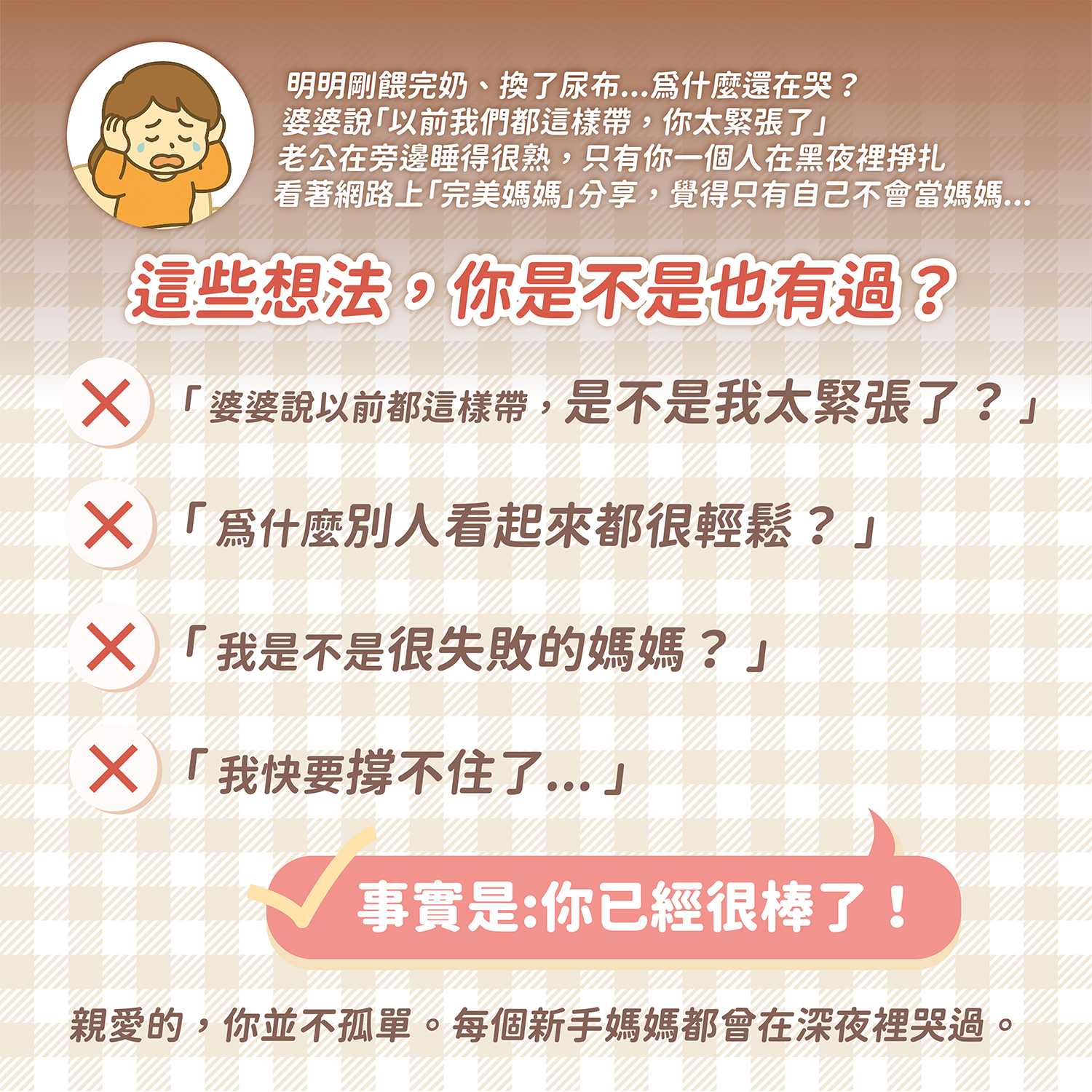 親愛的,請記住:你並不孤單。每個新手媽媽都曾在深夜裡哭過,這是育兒路上最真實的一部分。