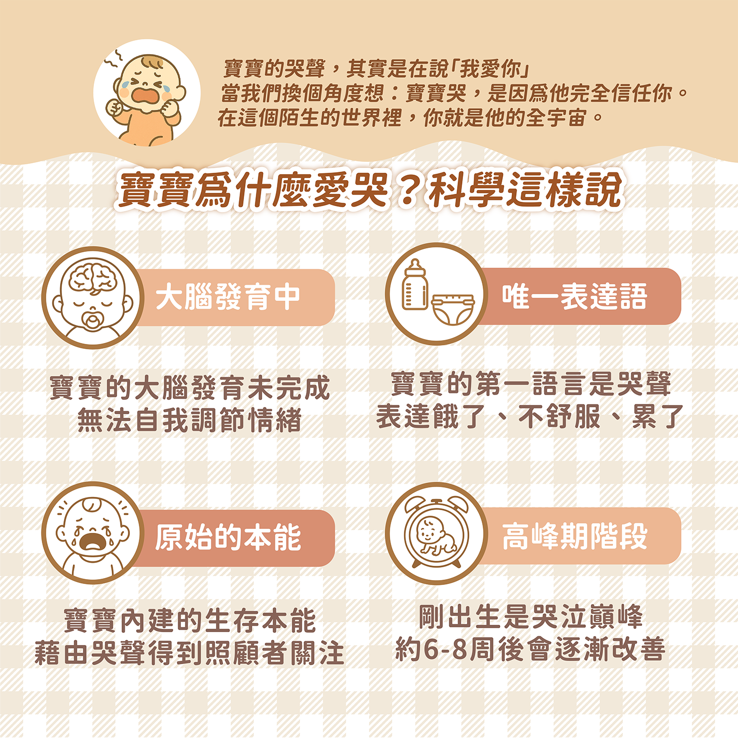 當我們換個角度思考,寶寶的哭聲其實傳遞著一個重要訊息:他完全信任你。在這個陌生的世界裡,你就是他的全宇宙。寶寶哭泣,是因為他知道你會回應,你是他最安全的依靠。