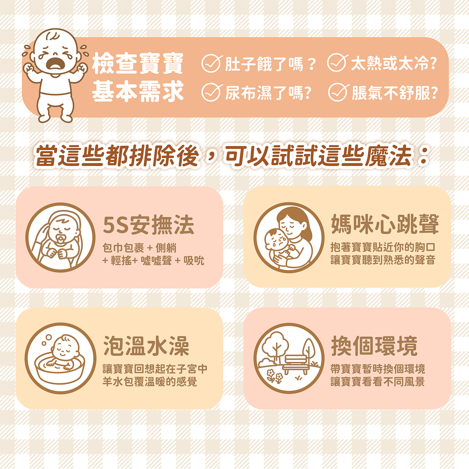 在嘗試其他安撫方法之前,先逐一檢查以下項目: