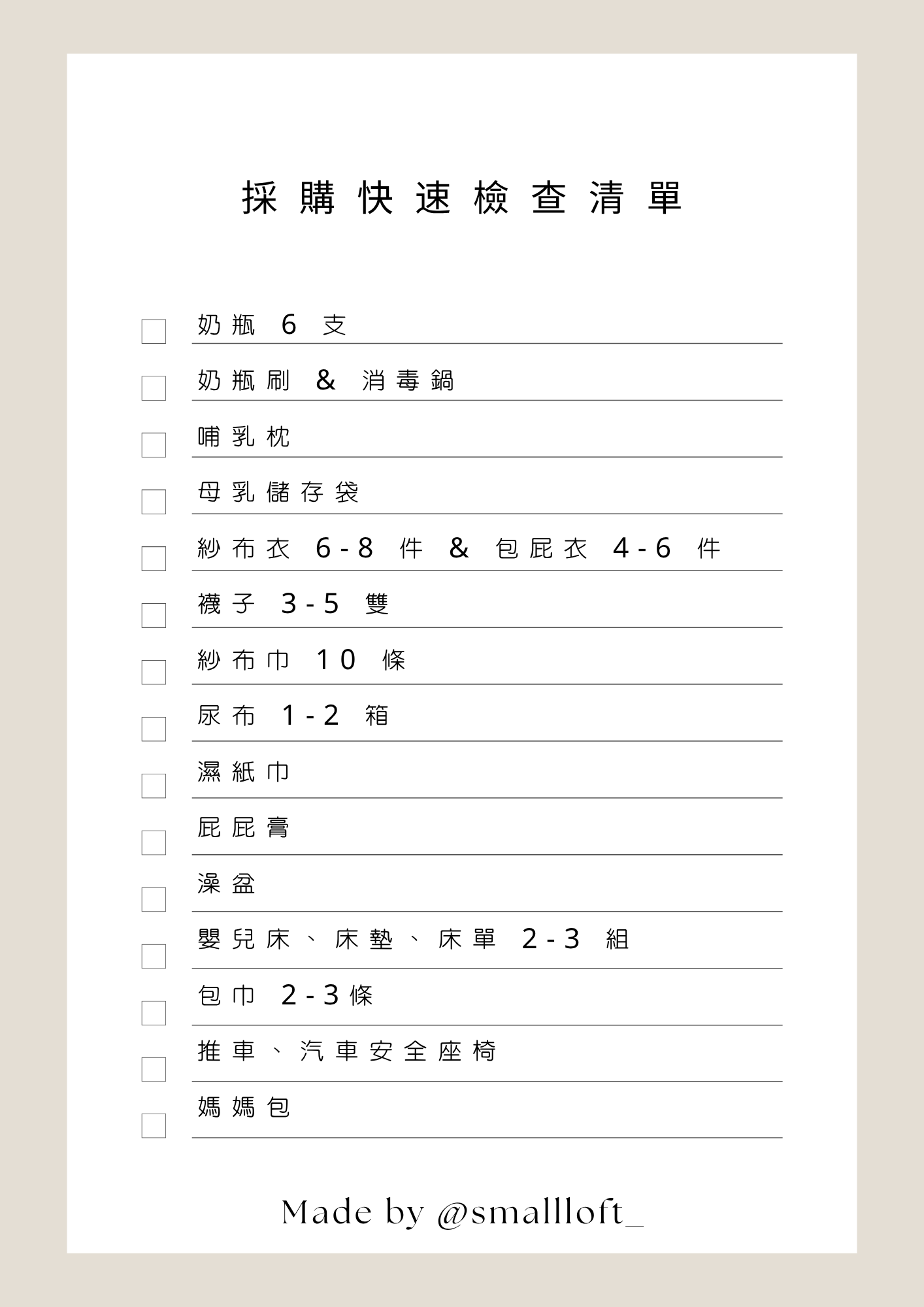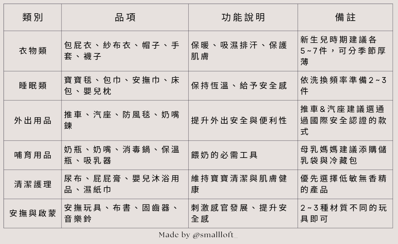 為方便新手爸媽準備,以下提供快速檢查清單: