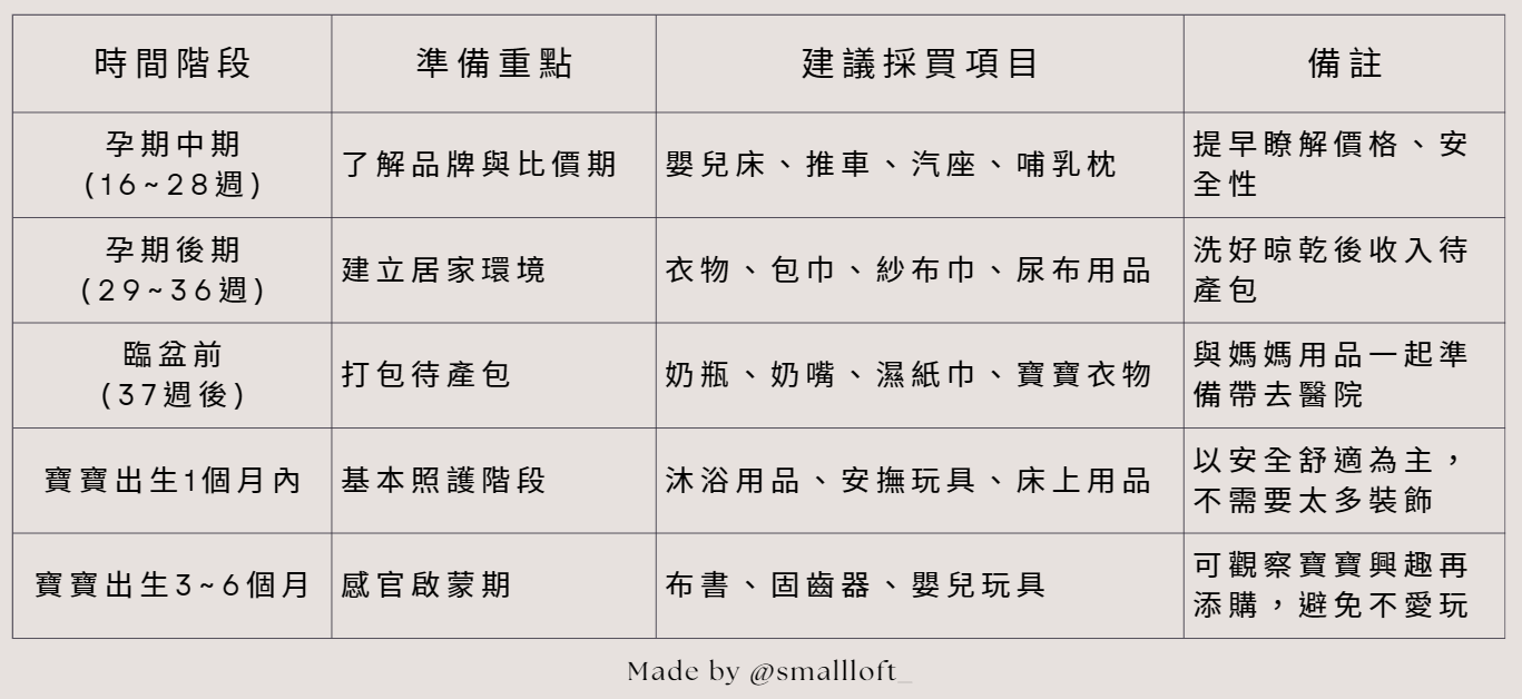 每個階段都有不同的準備重點,以下表格幫你整理出什麼時候該買以及可以先觀望的實用採購時程表: