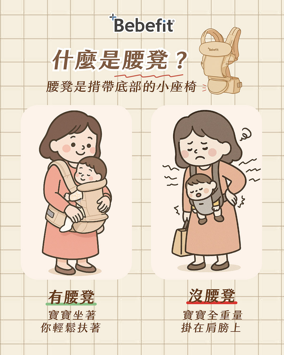 沒有腰凳是寶寶全身重量掛在你的肩膀上;有腰凳則是寶寶坐在小椅子上,你只需要扶著。
