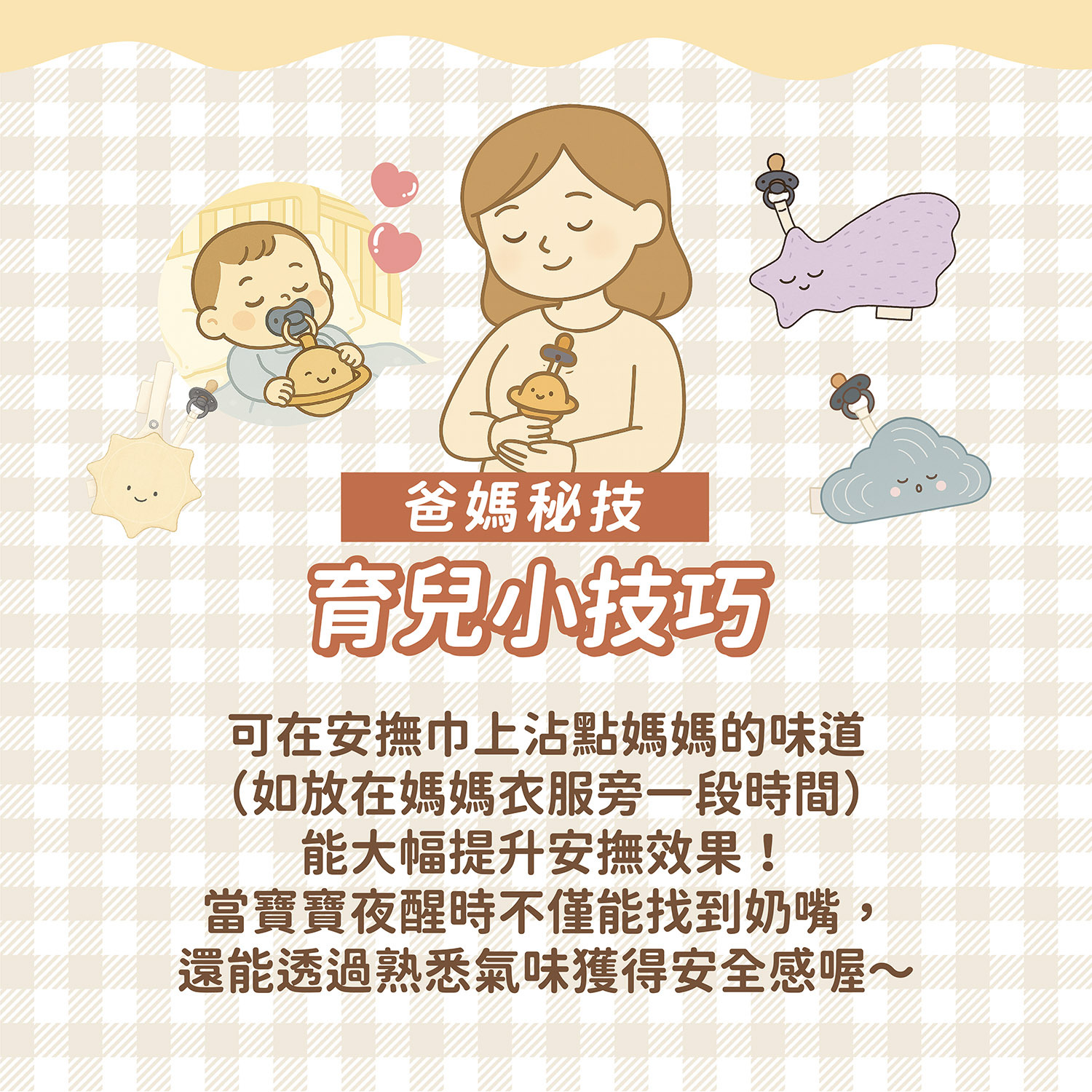 心理依戀:安撫巾提供柔軟、帶有熟悉氣味的觸感安慰,是如同媽媽擁抱的安全感替身。