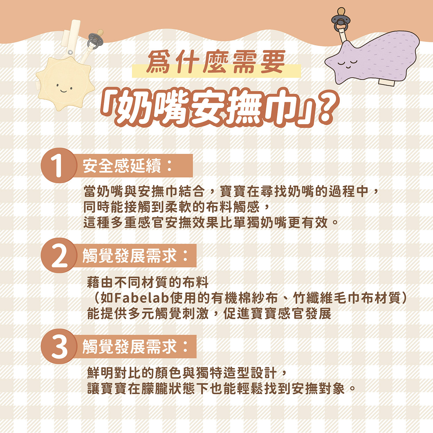 奶嘴安撫巾的設計核心,就是解決體積太小、容易丟失的痛點,同時為寶寶的發展帶來積極作用: