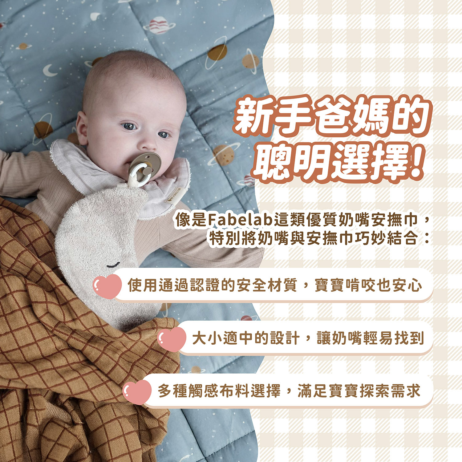 這些問題的核心在於:傳統奶嘴太小,無法被寶寶精準抓握,且容易在夜間遺失。然而,資深爸媽們找到了最佳解決方案:將「奶嘴」與「安撫巾」結合在一起!