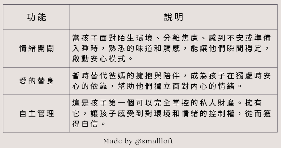 好處: 賦予小物生命與陪伴的意義,讓它成為家庭的一份子。爸媽可以常說:「小被被會保護你喔!」引導孩子跟它分享心事。