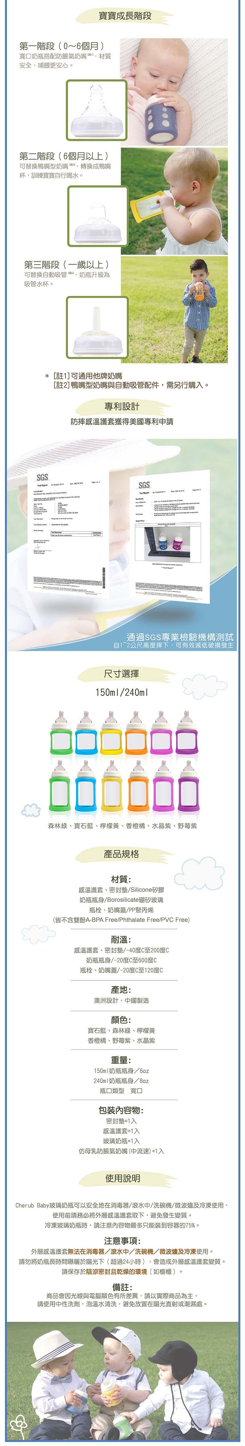 採用高強度硼矽玻璃製成,耐高溫亦可承受間溫差。外層搭配專利防摔感溫護套。當內容物超過42度時轉變為白色,貼心提醒父母哺餵溫度。