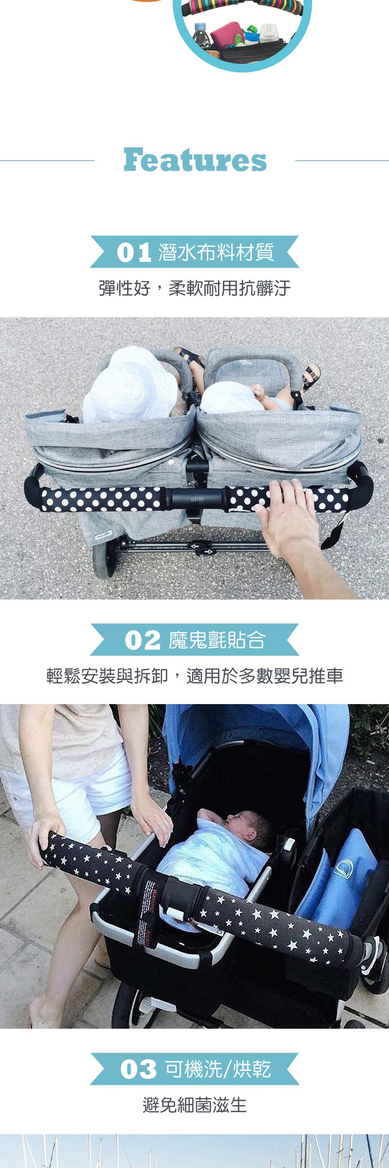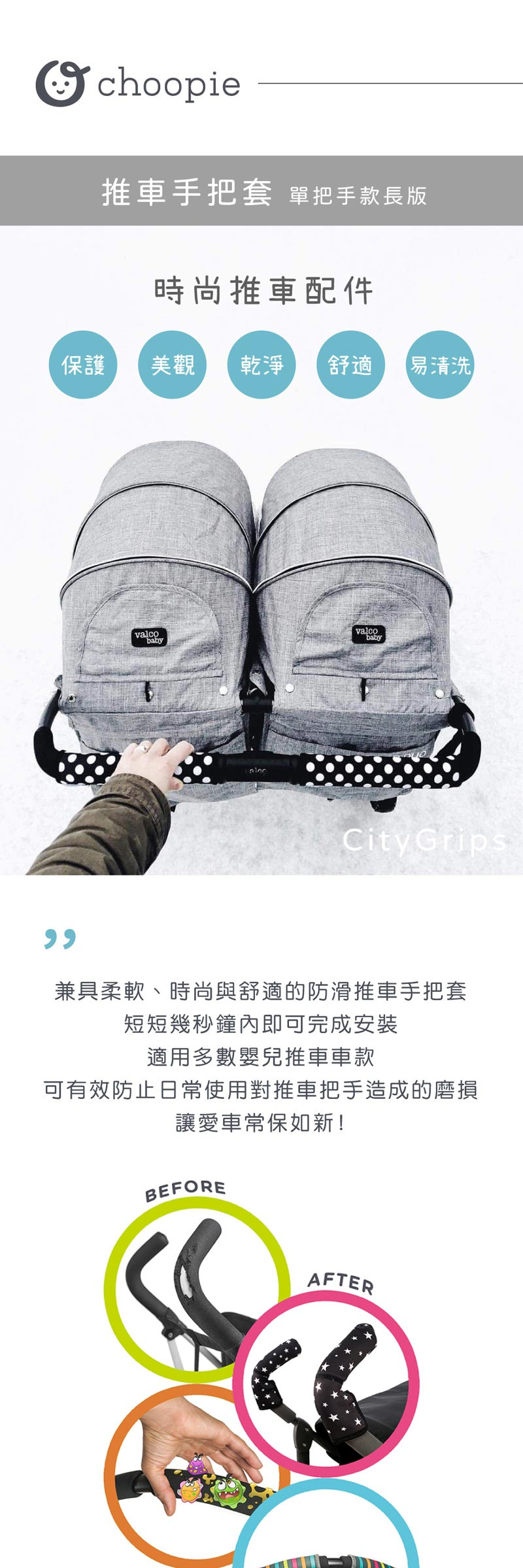 Choopie推車手把保護套簡單、快速、方便的裝卸方式