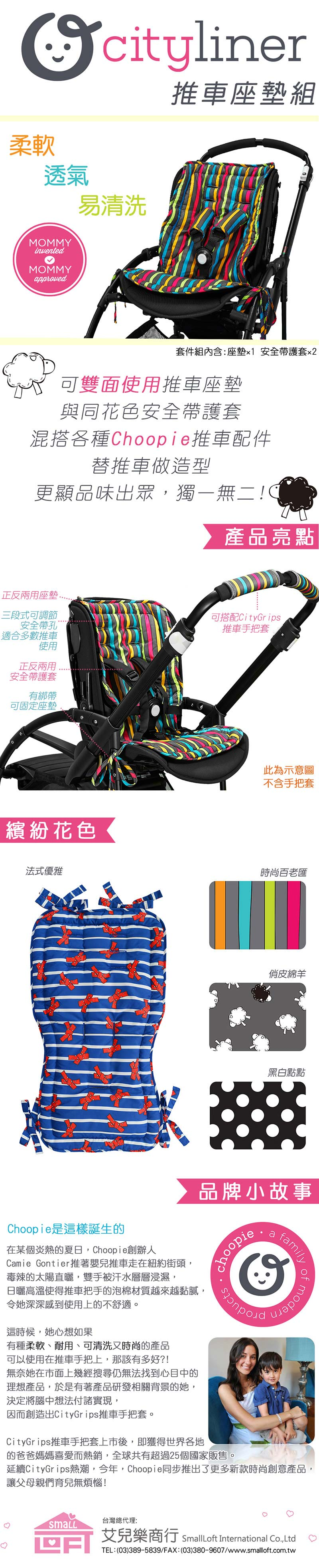 可雙面使用堆車座墊,與同花色安全帶護套,混搭各種choopie推車配件替推車做造型,更顯品味出眾,獨一無二!