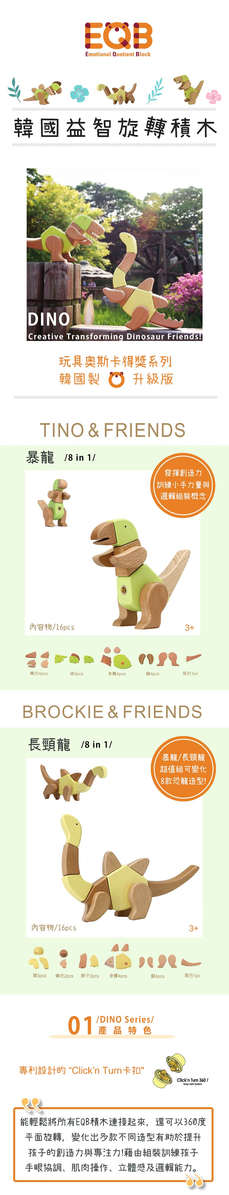 採用天然實木製成的無毒益智玩具。專利設計的卡扣,能輕鬆將所有EQB積木連接起來。藉由組裝訓練孩子手眼協調、立體感及邏輯能力。