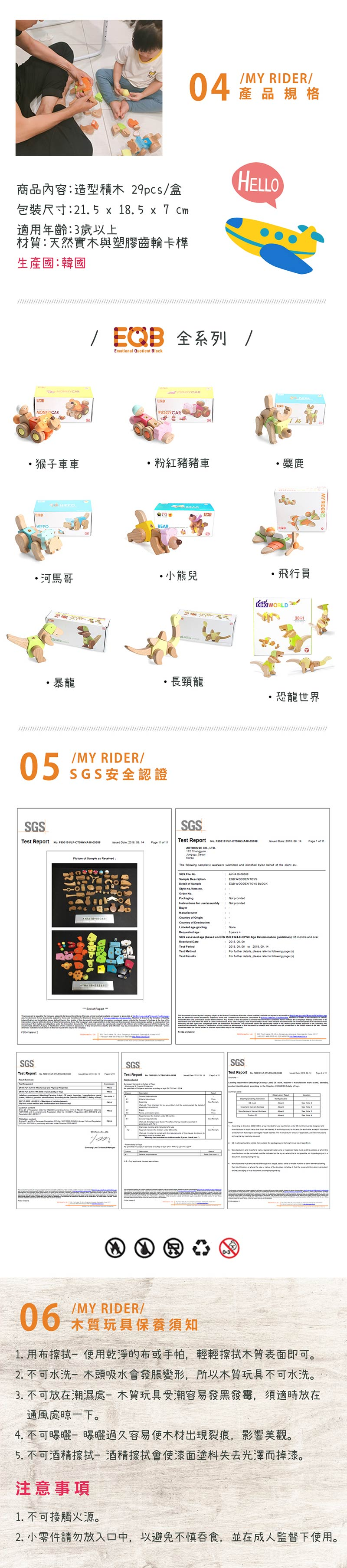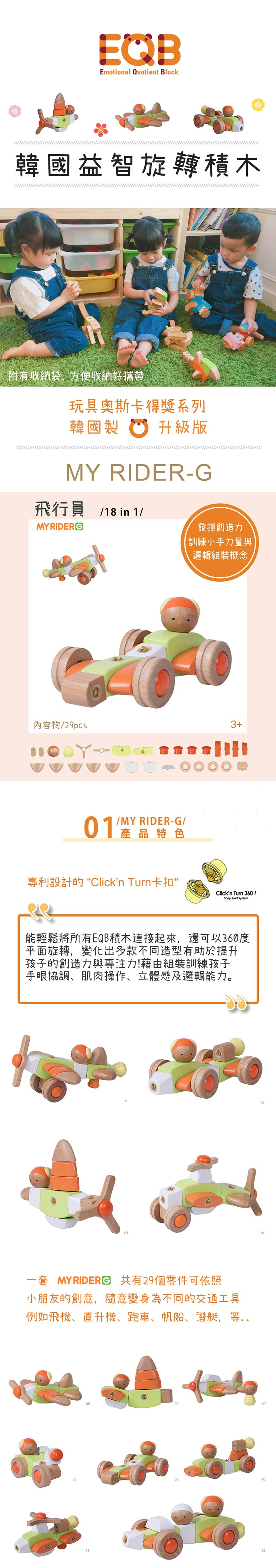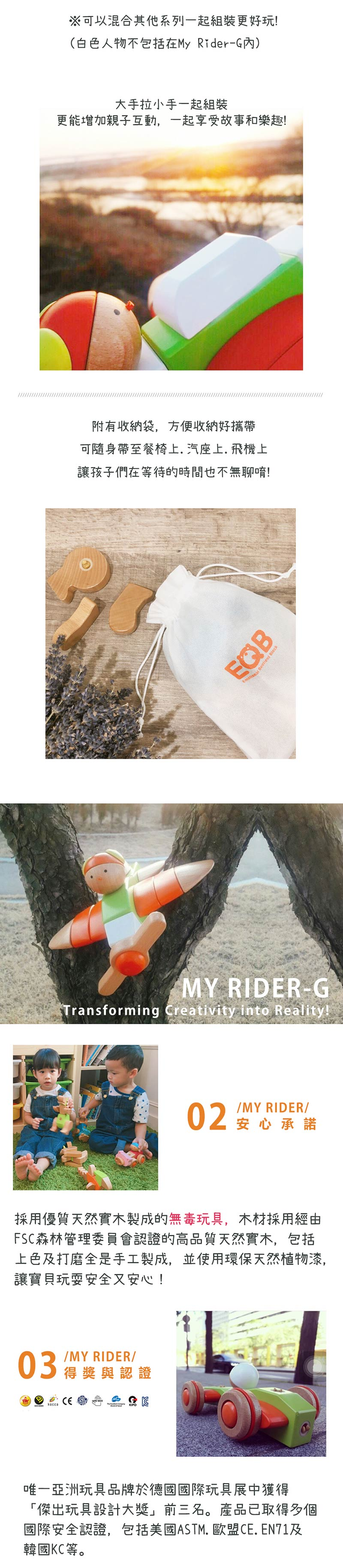 採用天然實木製成的無毒益智玩具。專利設計的卡扣,能輕鬆將所有EQB積木連接起來。藉由組裝訓練孩子手眼協調、立體感及邏輯能力,發揮孩子的想像力。