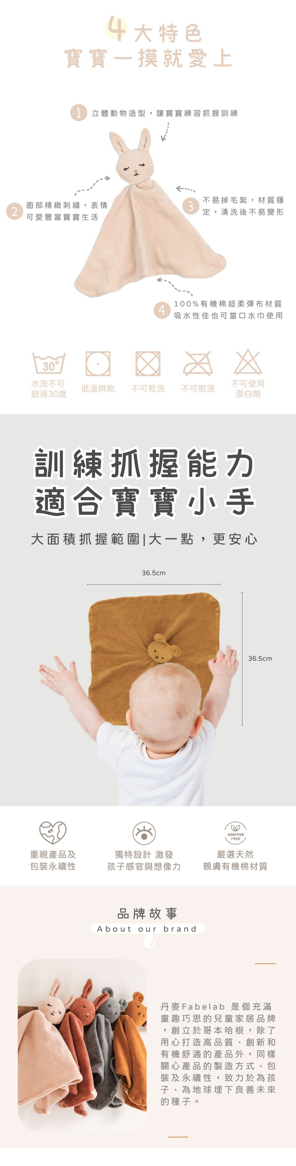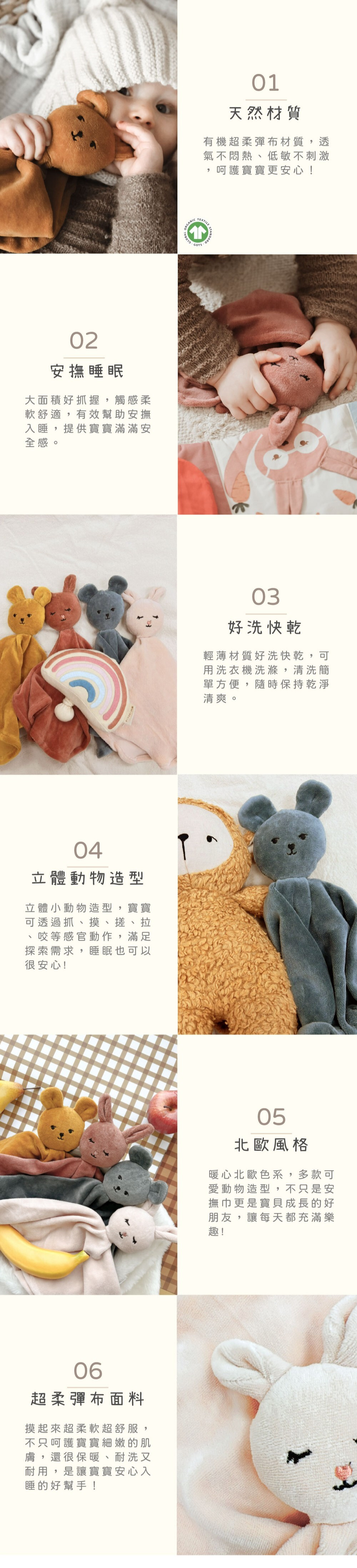 寶寶不哭不哭,我們陪你~ 100%有機棉x環保再生填充,親膚低敏不刺激,大面積好抓握,好洗快乾,童趣動物造型,啟發寶貝無限想像力,透過抓握、啃咬滿足寶貝探索需求,一巾多用滿足寶貝所有需求,可當口水巾、安撫巾、 玩具,造型可愛,送禮自用兩相宜,給寶貝最好的見面禮!