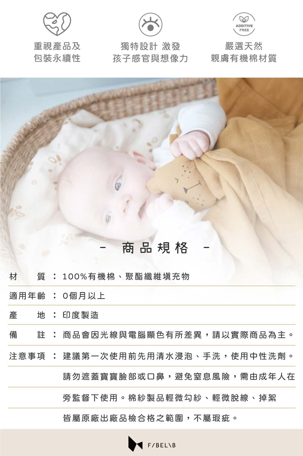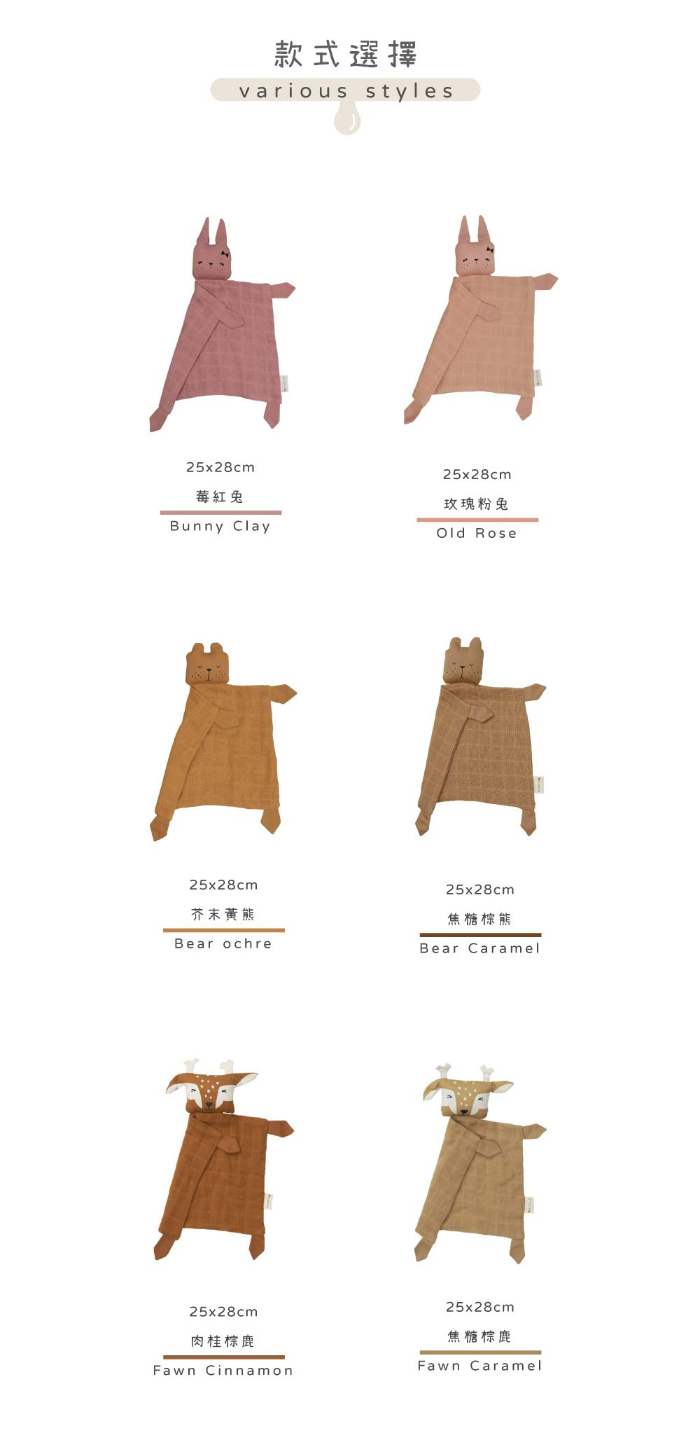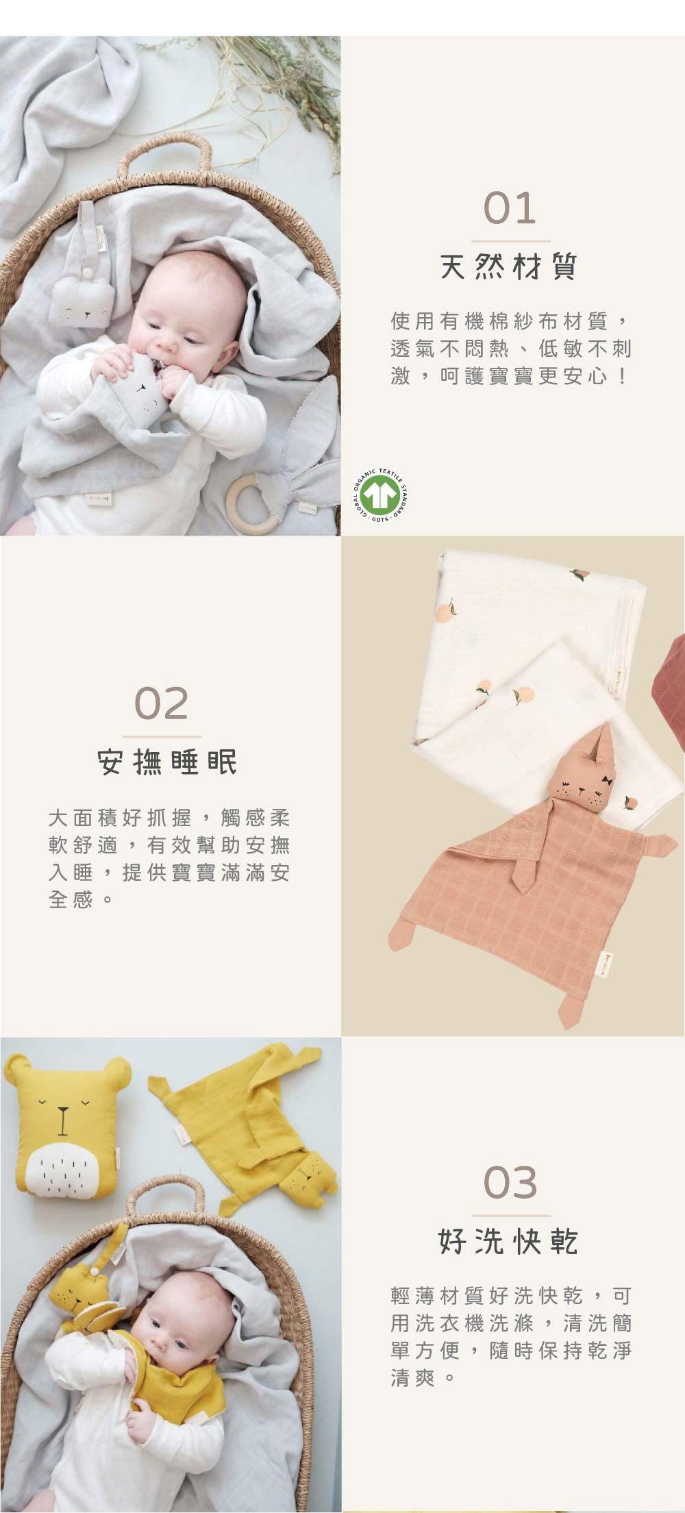 寶寶不哭不哭,我們陪你~100%有機棉x環保再生填充,親膚低敏不刺激,大面積好抓握,好洗快乾,童趣動物造型,啟發寶貝無限想像力,貫穿抓握、啃咬滿足寶貝探索需求,一巾多用滿足寶貝所有需求,可當禮巾、安撫禮巾、玩具,造型可愛,送禮
