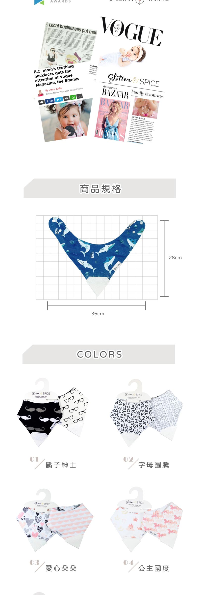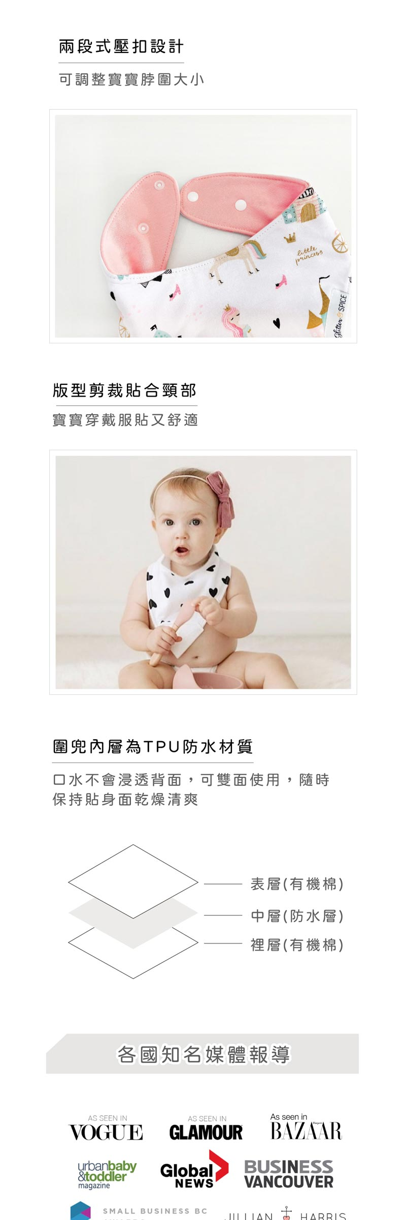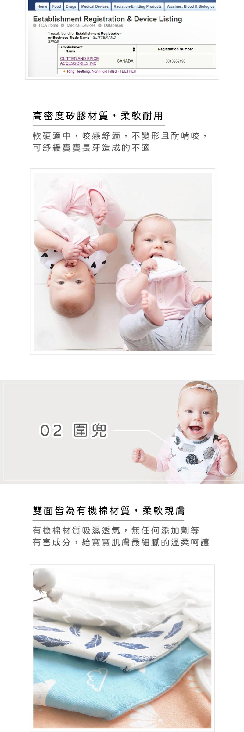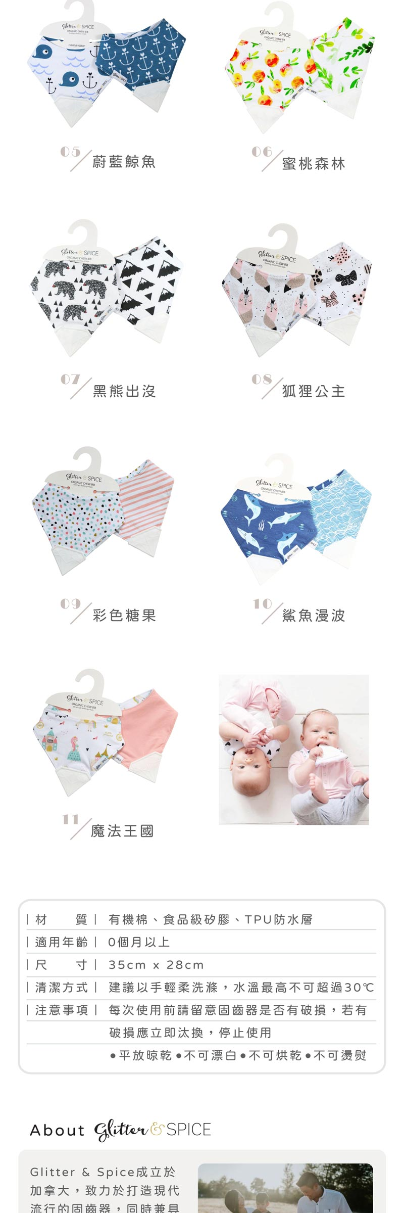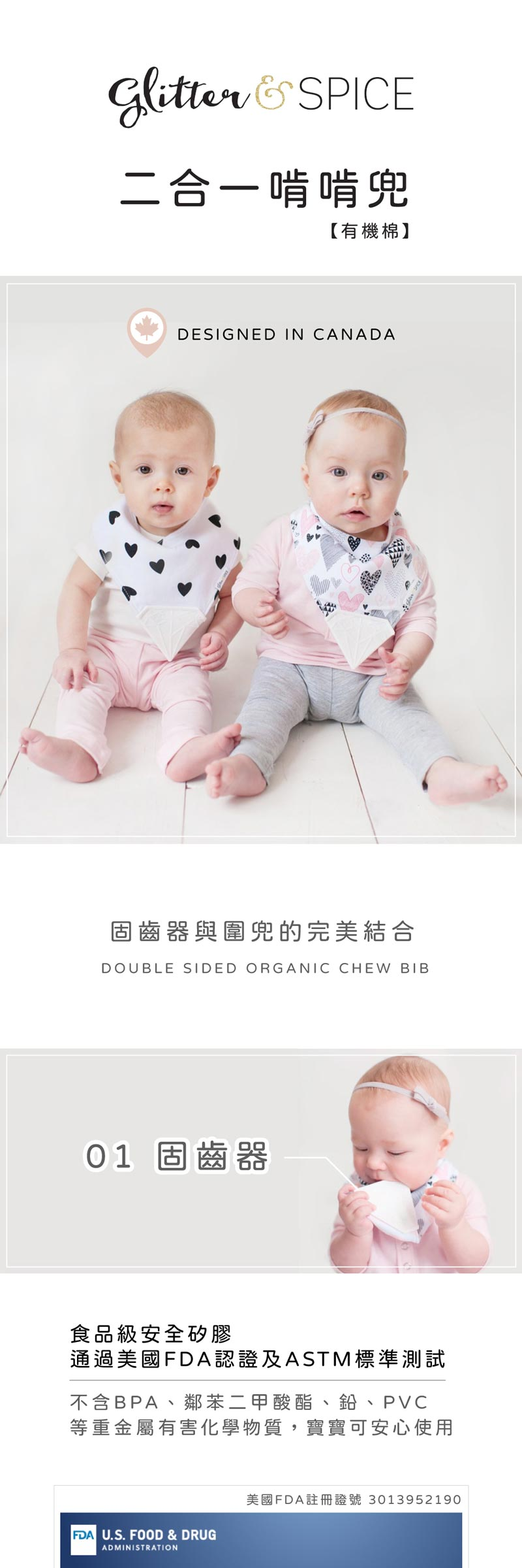 加拿大Glitter&Spice有機棉二合一啃啃兜,100%天然有機棉,親膚柔軟吸水性佳。內襯TPU透氣防水層,口水不滲透。下擺獨特鑽石造型固齒器,可緩解寶寶長牙不適,也不怕搞丟固齒器!正反使用隨心搭配,可當口水巾、固齒器圍兜及領巾使用。