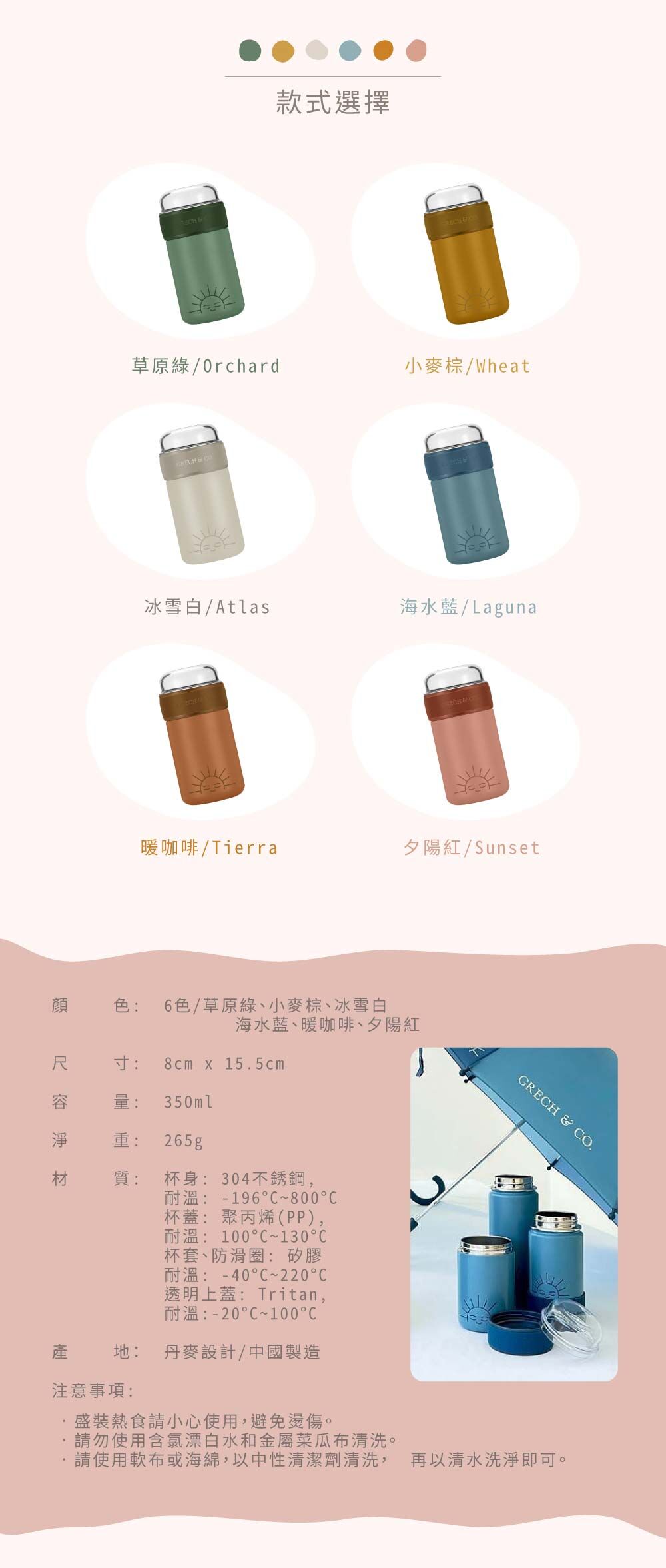 材質:杯身/ 304不鏽鋼 ; 杯蓋/ pp ; 杯套、防滑圈/ 矽膠 ; 透明上蓋/ Tritan