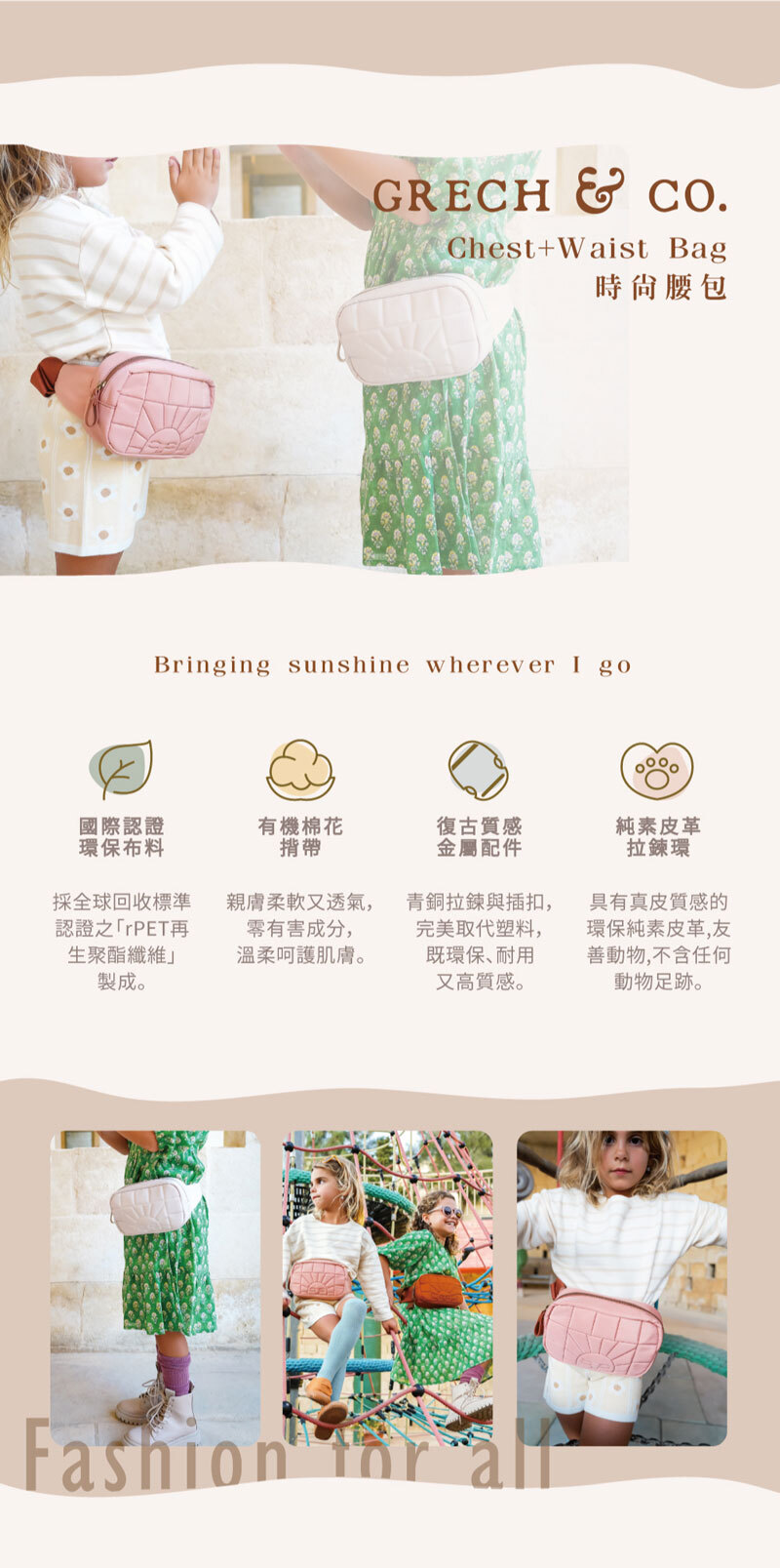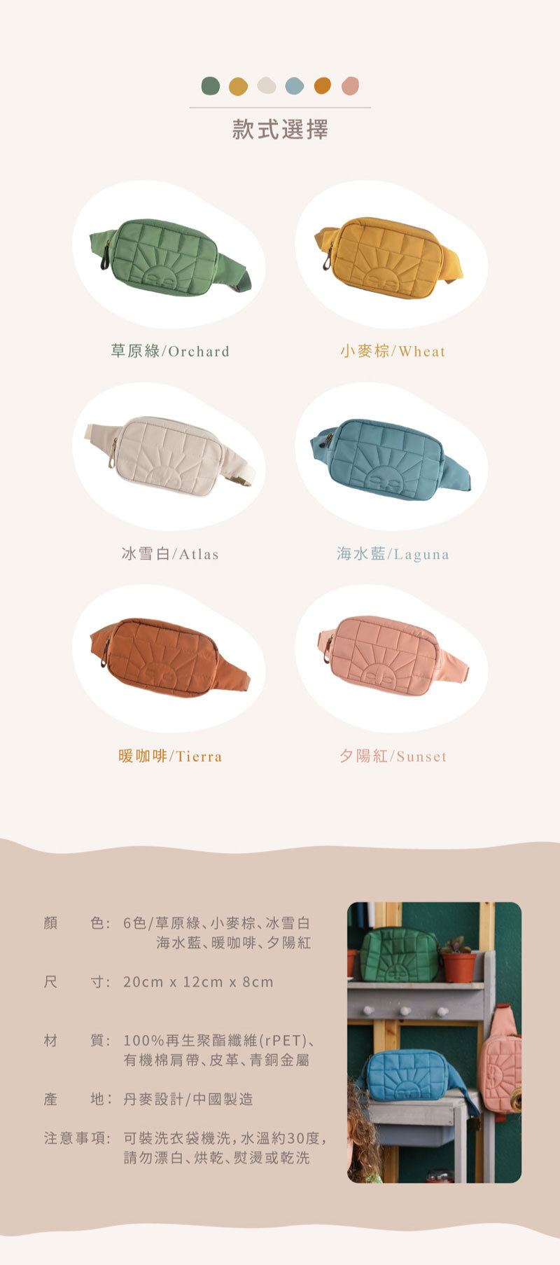 材質:100%再生聚脂纖維、有機棉肩帶、皮革、金屬