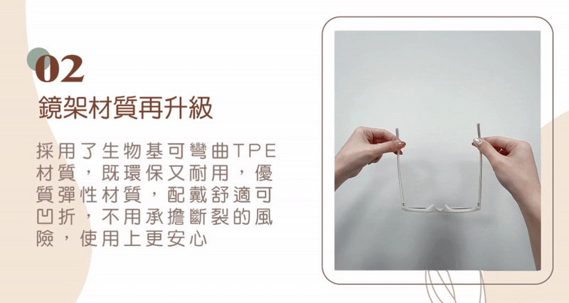 ✔框架採用了生物基可彎曲TPE材質,既環保又耐用,讓你享受時尚的同時還能對地球更友善!