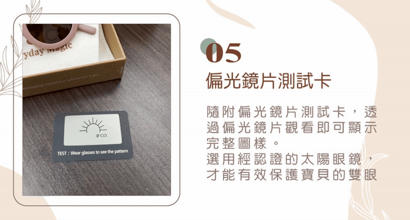 ✔包裝盒內貼心附贈偏光鏡片測試小卡,選擇有認證的偏光鏡片才能真正保護孩子的眼睛