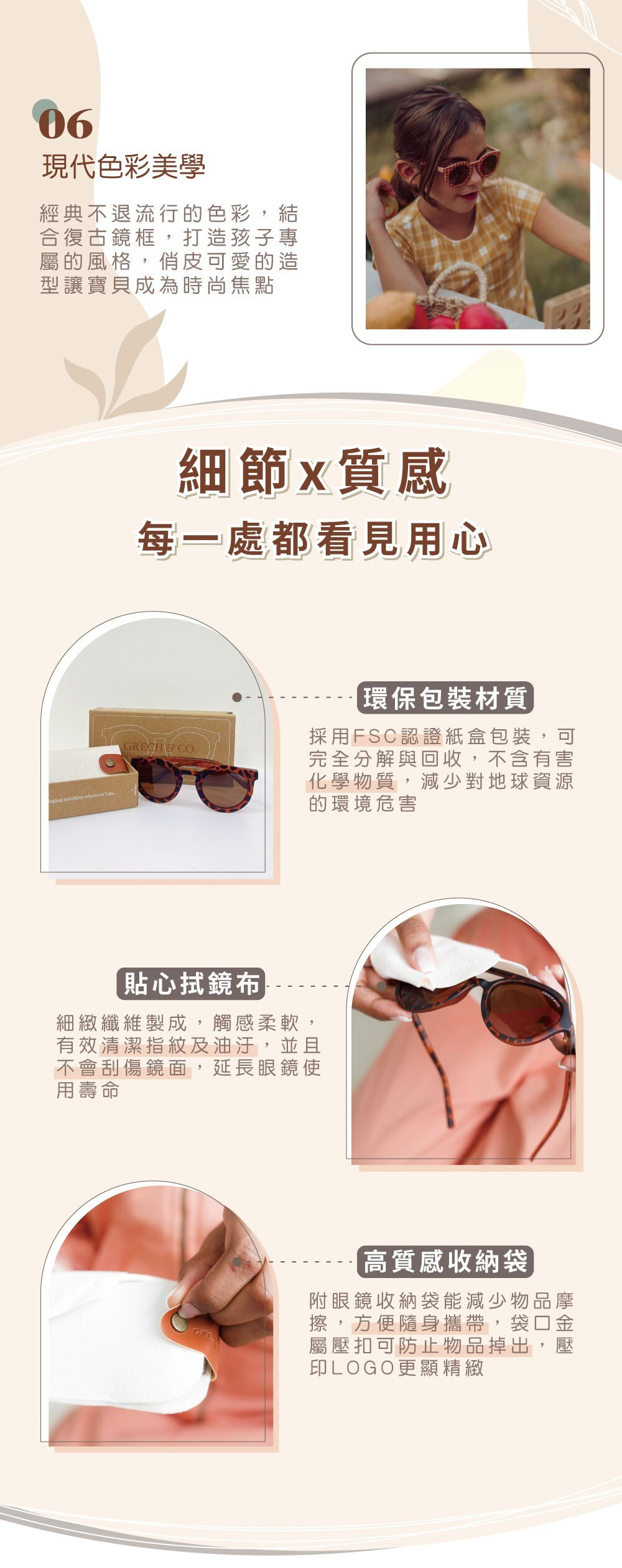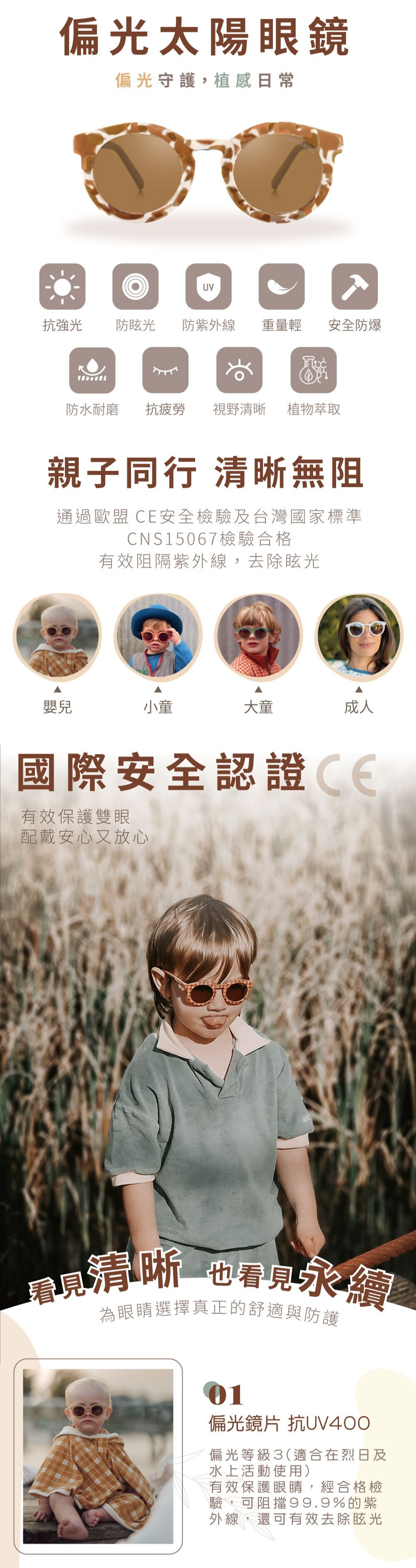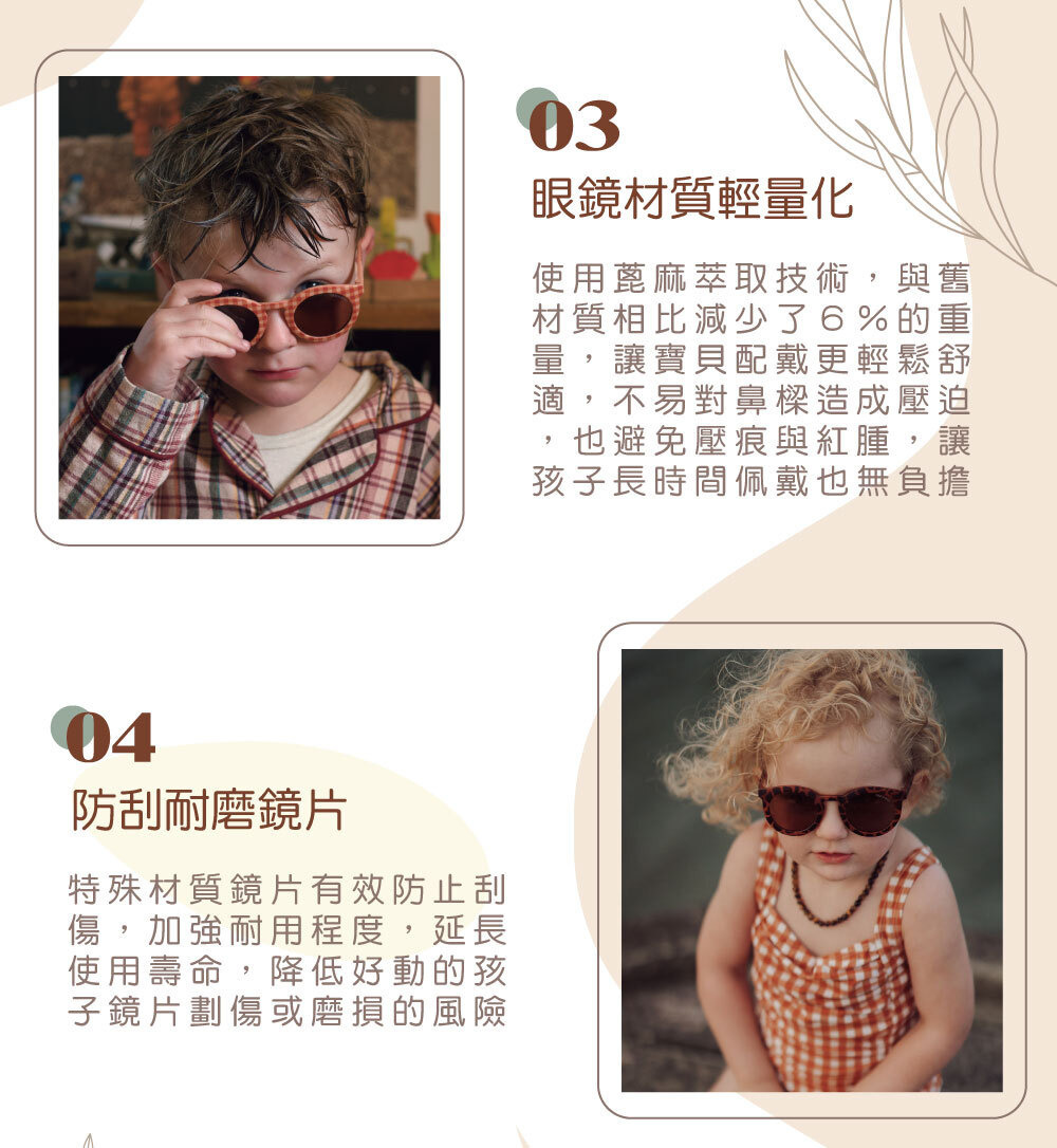 ✔鏡片使用偏光鏡片,讓寶貝看得更清楚,更對環境友善,實現真正的可持續時尚!