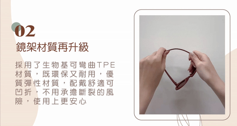 ✔框架採用了生物基可彎曲TPE材質,既環保又耐用,讓你享受時尚的同時還能對地球更友善!
