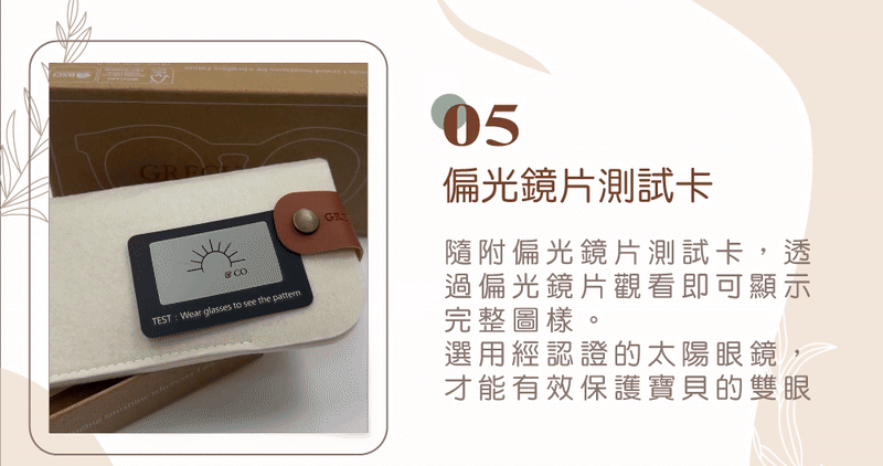 ✔包裝盒內貼心附贈偏光鏡片測試小卡,選擇有認證的偏光鏡片才能真正保護孩子的眼