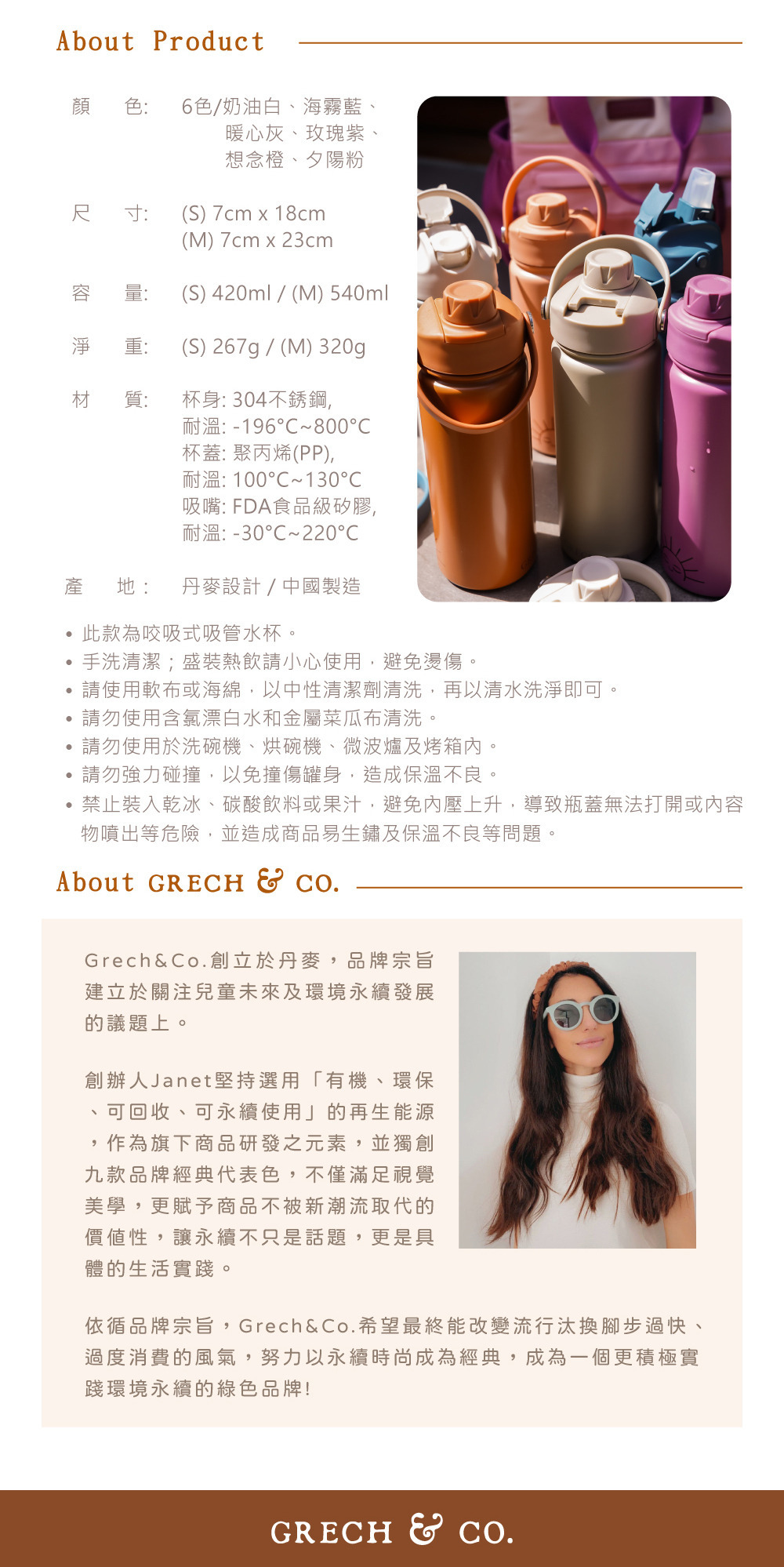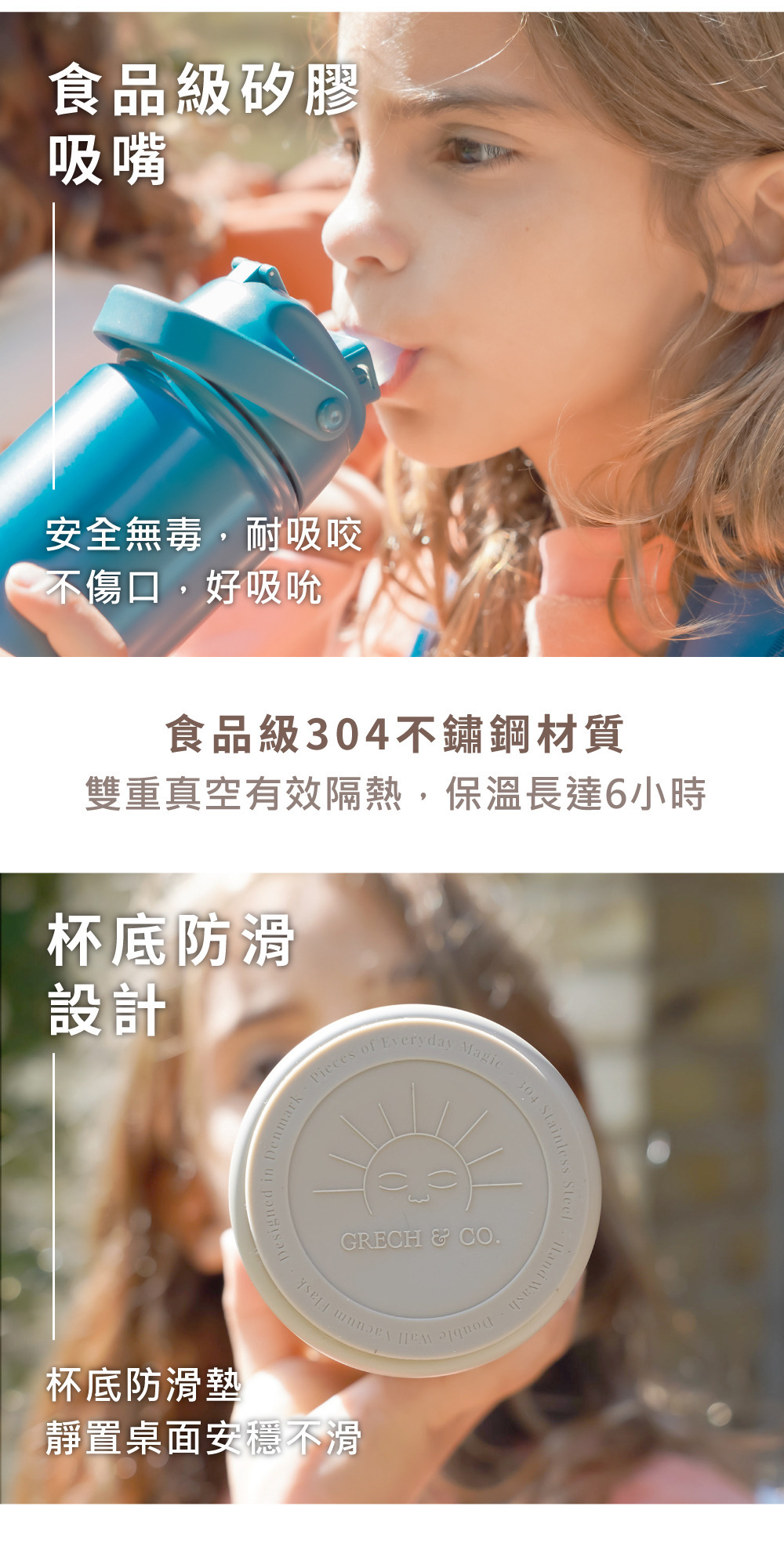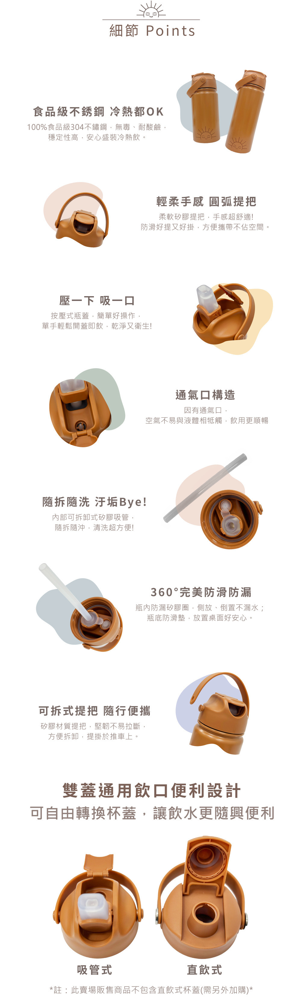 採用食品級304不鏽鋼,無毒、耐酸鹼,可安心盛裝冷熱飲。食品級矽膠吸管,不含BPA安全好吸吮。真空密封長效保溫保冷6小時。按壓式瓶蓋,輕鬆單手開瓶暢飲。便攜圓弧矽膠提把,一手帶著健康、環保、時尚。
