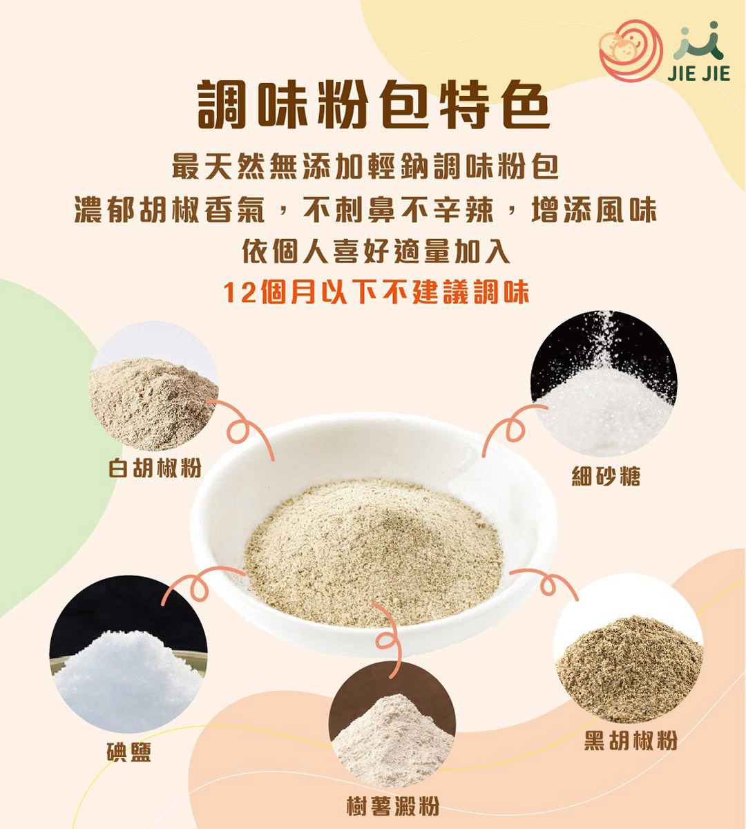 調味粉包成分:碘鹽、細砂糖、樹薯澱粉、黑胡椒粉、白胡椒粉