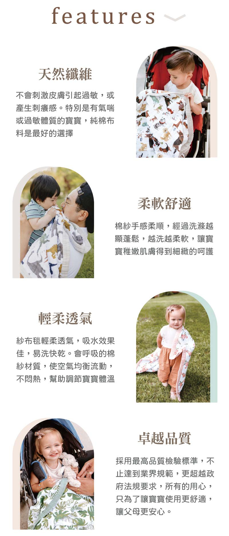 ✔ 四層純棉紗交織,吸濕透氣、柔軟不悶熱,幫助寶寶穩定體溫