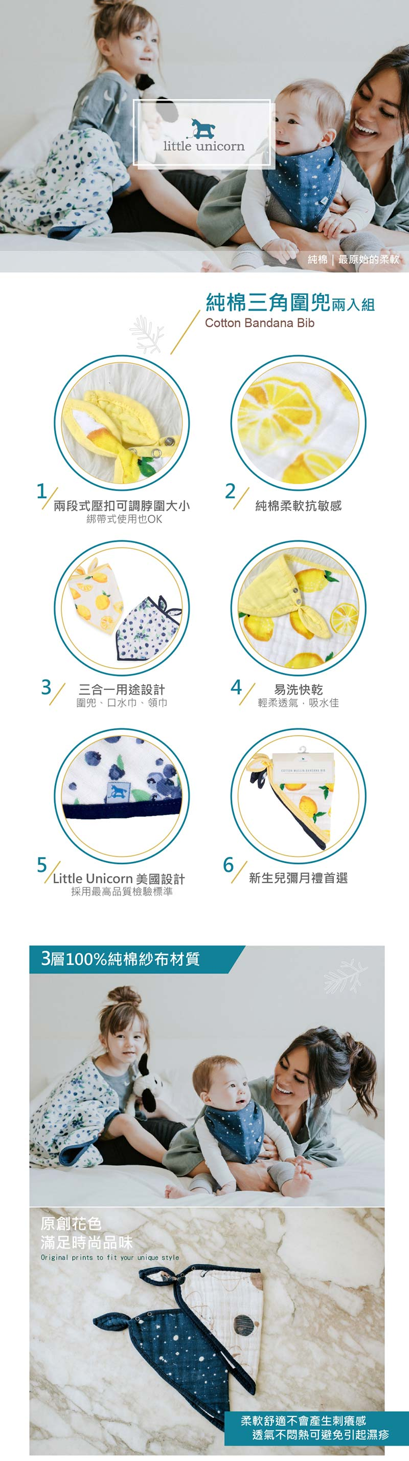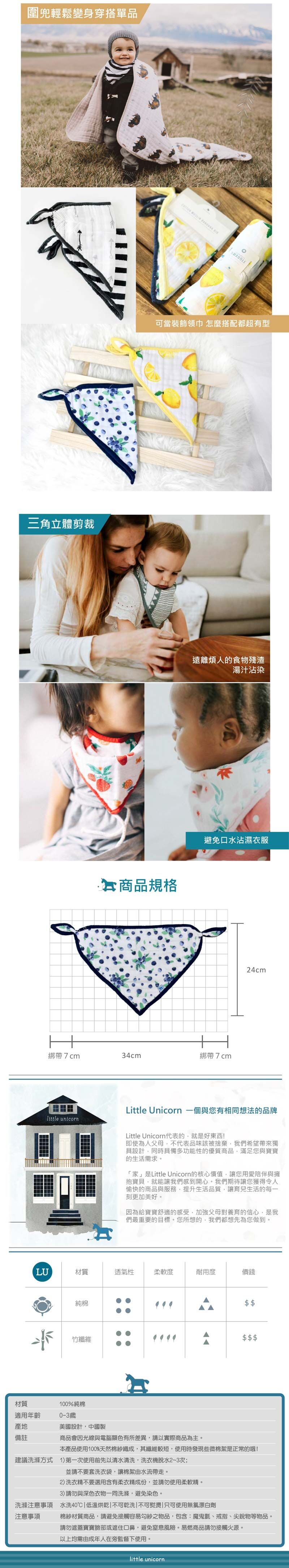 兩段式壓扣可調脖圍大小。純棉柔軟抗敏感,透氣度高吸水性佳。可當圍兜、領巾及口水巾使用。
