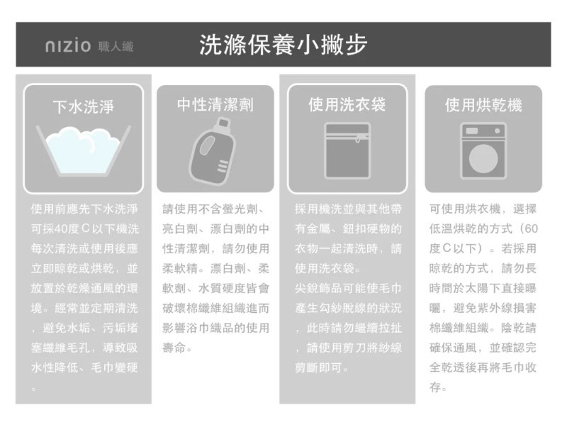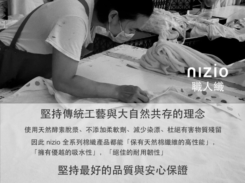 超過一甲子毛巾織造經驗的老師傅監製。透過對台灣生活習慣與環境、文化的了解,打造真正適合台灣人使用習慣與喜好的毛巾。在環保意識與健康安全理念的驅使下,毛巾織品製作過程中必經的撚紗、織造、染漂排除所有化學藥劑的使用。依循天然但繁複的織造古法技術製作,屏棄了追求快速效率的工業化製造,不僅讓製作的過程中減少了大量水資源的使用,也讓100%棉織的毛巾保留了棉纖維最原始優異的吸水與透氣性,避免肌膚接觸不必要的化學殘留藥劑,同時也大大提升了成品的耐久性,充分體現了台灣傳統愛物惜物的美好文化。