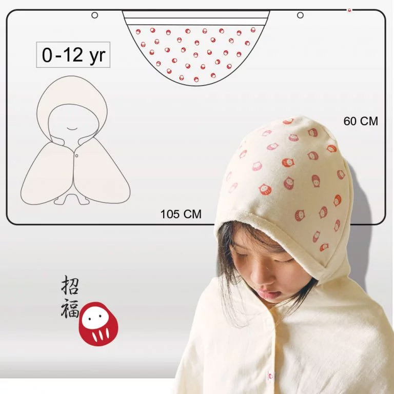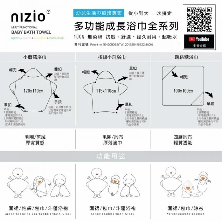 帽兜斗篷浴巾能完美取代70X70cm傳統的帽兜嬰兒浴巾,擁有大尺寸的帽兜+浴袍斗篷的穿戴功能。105x60cm不含帽兜的本體尺寸充分滿足從小小孩到大小孩的日常浴巾使用需求。浴巾材質為表層紗布內層毛巾布,吸水、透氣、快乾。