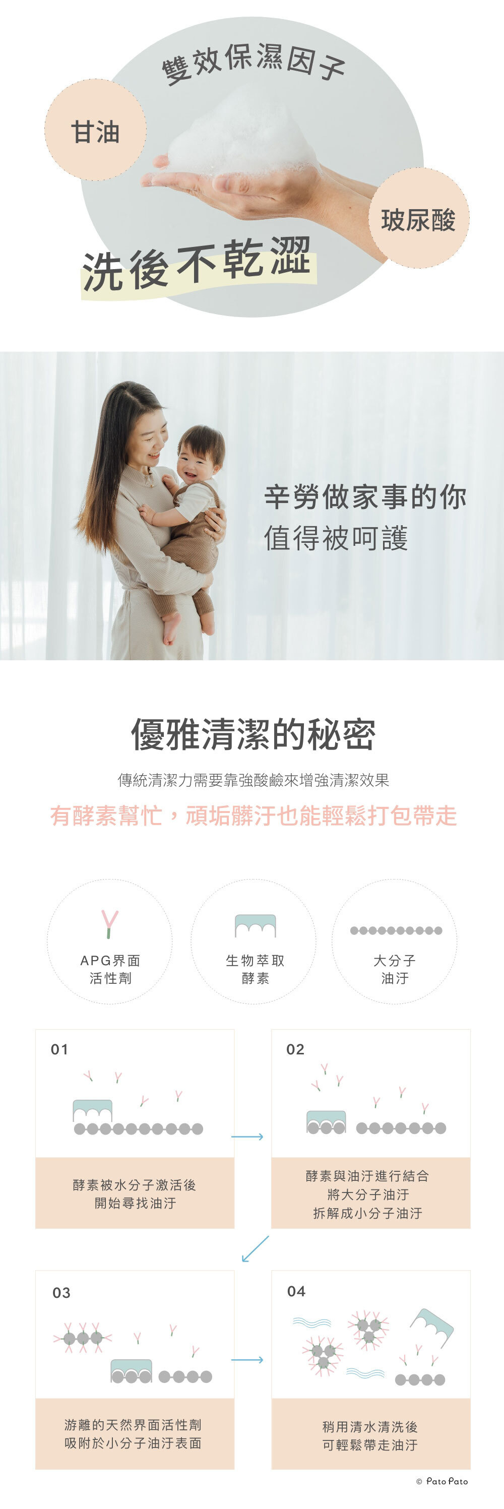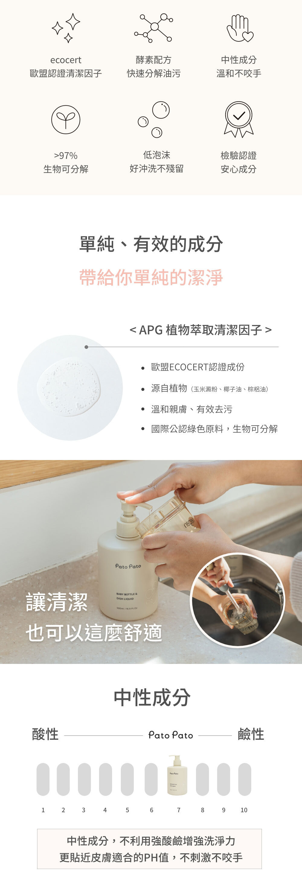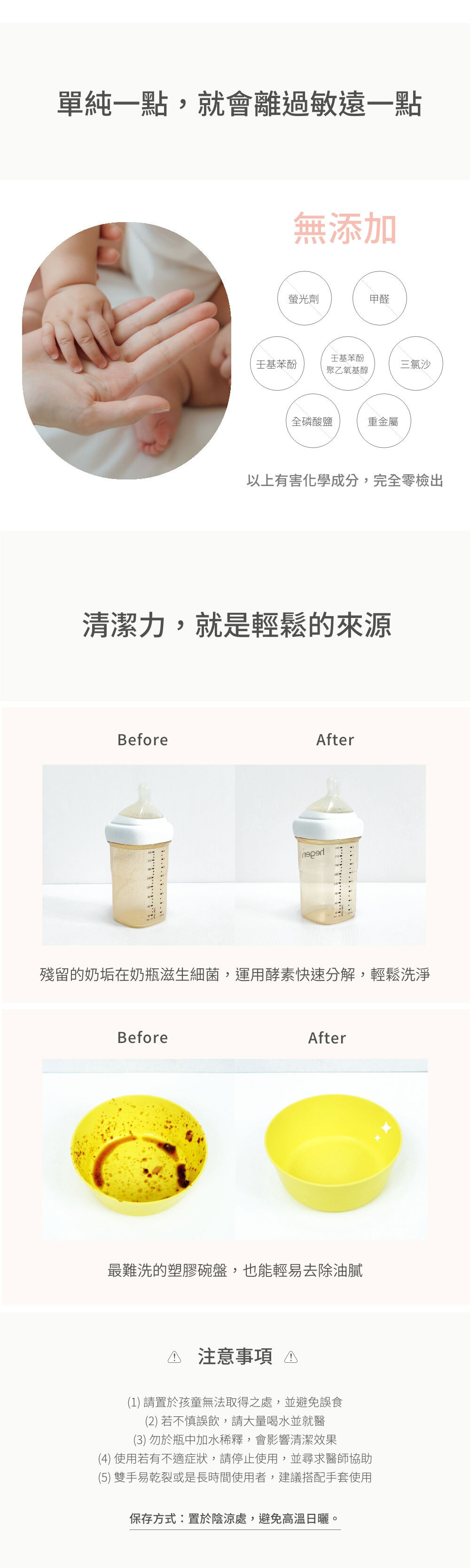 ✔優雅清潔解方,專對付蛋白質、油脂,適合清潔奶瓶、餐具、接觸口腔的玩具、蔬果
