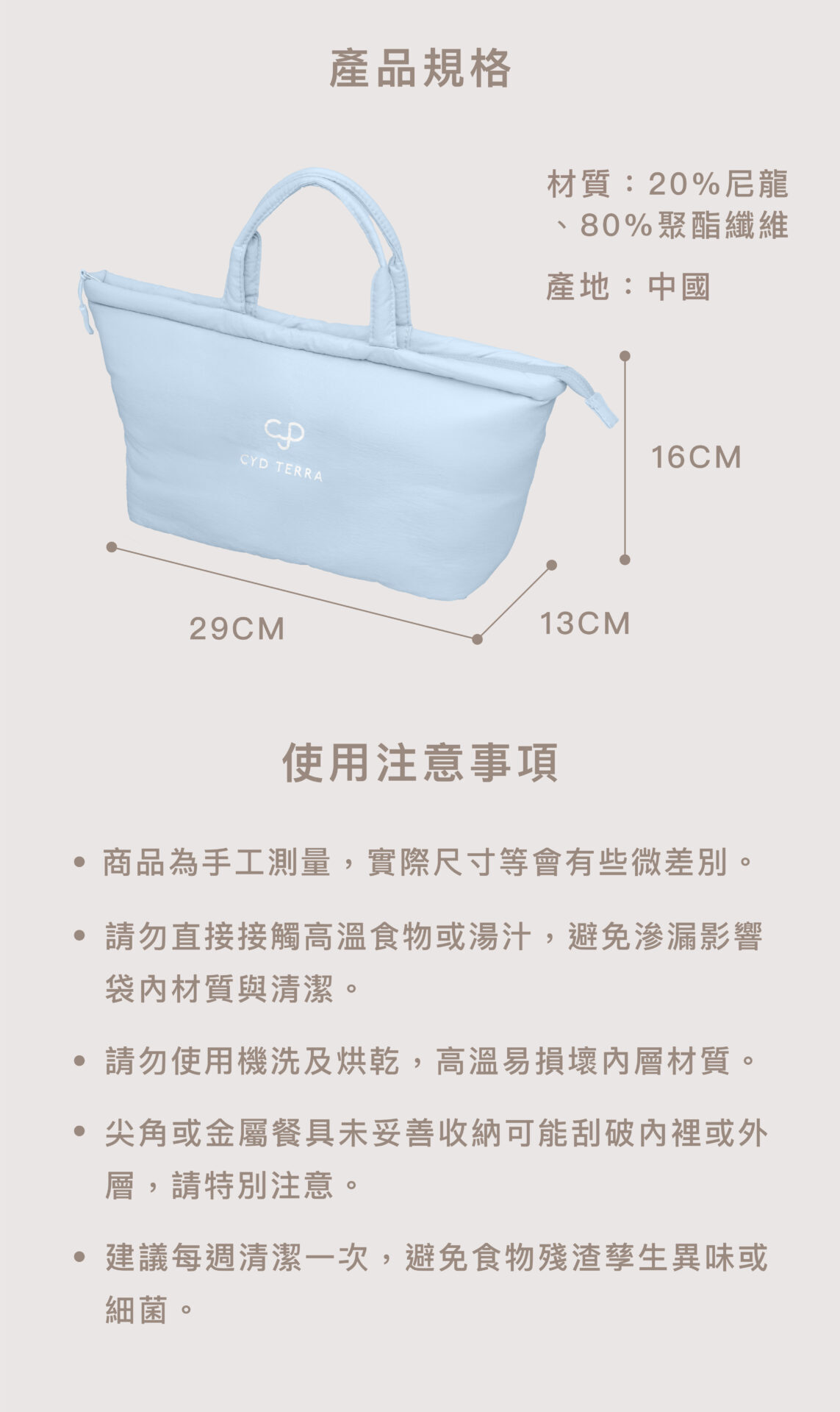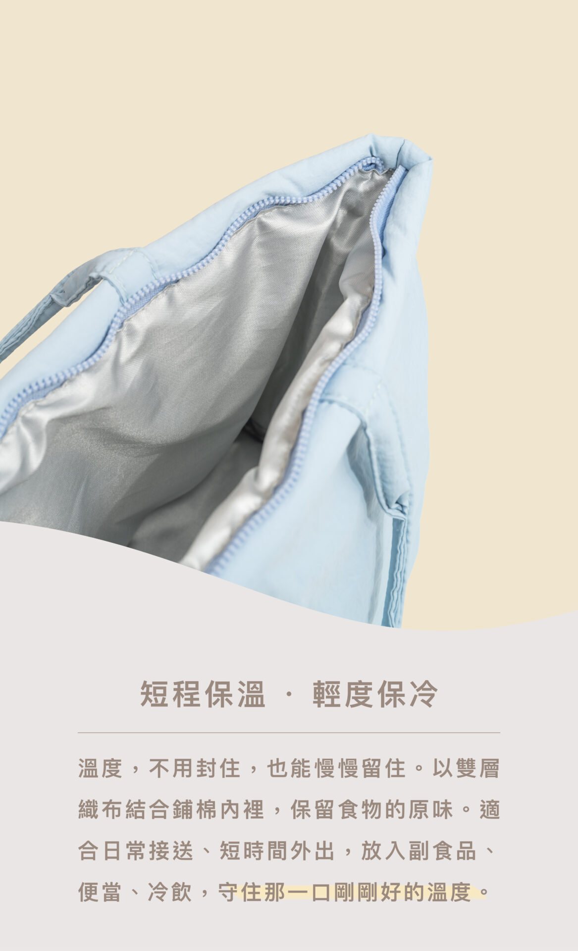 以雙層織布結合鋪棉內裡,輕盈柔軟、無鋁膜,無塑感