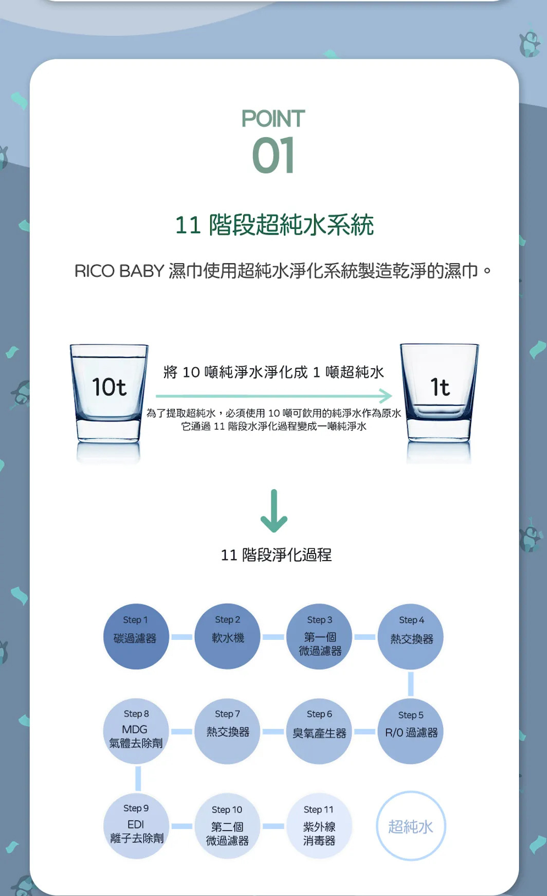 ✔11階淨化過程,去除殘留離子、殺死細菌、微粒等安全的超純水來製造濕紙巾