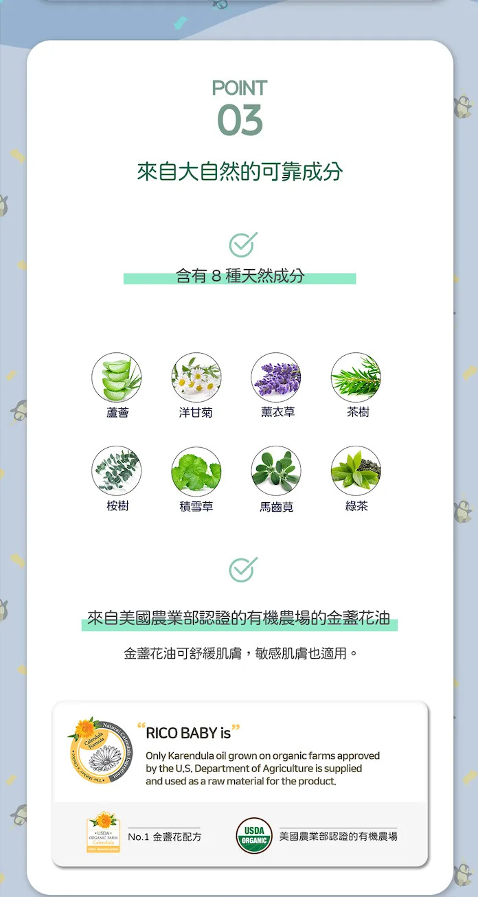 ✔含有八種天然成分(蘆薈、洋甘菊、薰衣草、茶樹、桉樹、積雪草、馬齒莧、綠茶)